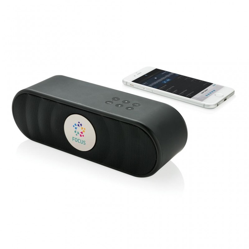 Bezdrátový stereo reproduktor s pogumovaným povrchem. Na horní straně vybaven 6 tlačítky pro jednoduché ovládání: zvýšení/snížení hlasitosti, přijetí hovoru, zapnutí/vypnutí a tlačítko zvuku pro nastavení basů a optimálního zvuku. Na spodní straně se nachází dva proužky pro optimální stabilitu a kvalitu zvuku. Baterie má kapacitu 1 200 mAh, takže budete moci za optimálních podmínek poslouchat hudbu po dobu až 10 hodin. Reproduktor také nabízí možnost připojení pomocí klasického kabelu s audio konektorem.