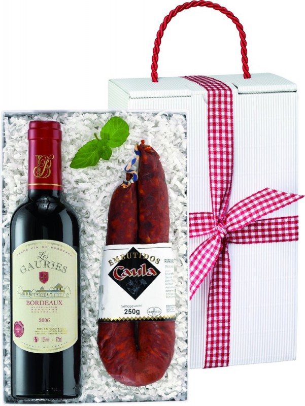 V jednoduchosti je krása! Malá láhev „Les Gauries Bordeaux“ (0,375 l) a španělský paprikový salám (250 g).