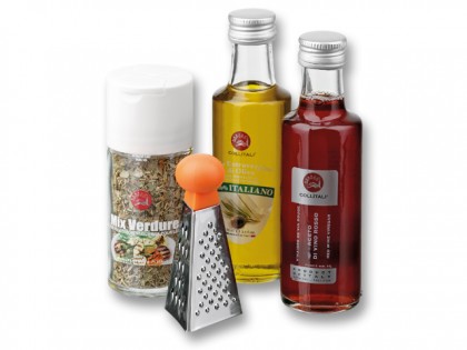 Tato sada je naprosto jedinečná! Obsahuje extra panenský olivový olej (100 ml), ocet z červeného vína (100 ml), struhadlo a směs koření a bylinek na zeleninu (27 g). Dopřejte vašim zákazníkům ten správný požitek z jídla. Vše v elegantním dárkovém balení.