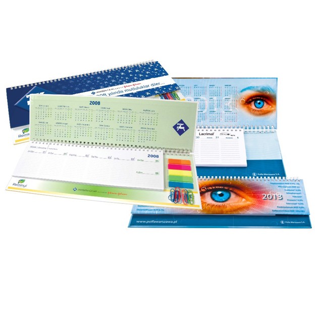 Kalendář v tvrdých deskách lze pohodlně používat v kanceláři i při práci v terénu. Lze ho přizpůsobit tak, aby co nejlépe vyhovoval potřebám vašich klientů i potřebám vaší reklamní kampaně. Desky mohou být pevné nebo se spirálovou vazbou, lze je doplnit poznámkovým blokem, samolepícím bločky, barevnými rozlišovacími indexy i kancelářskými sponkami s magnetickou podložkou.