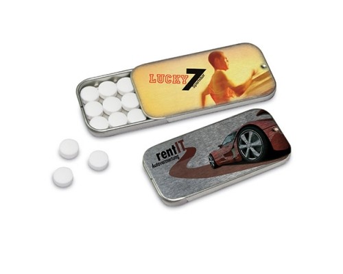 Nabídněte bonbony stylově v plechové krabičce s vaším vlastním potiskem. Vyberte si 4barevný digitální potisk, až 4barevný tamponový potisk nebo ražbu a vytvořte svůj vlastní originál. Plochá lesklá krabička s vysunovacím víčkem bude vašim zákazníkům určitě sloužit i po zkonzumování bonbonů. A vaše reklama tak bude žít spoustu let. Obsahuje 17 kusů mentolek bez cukru (se stévií).