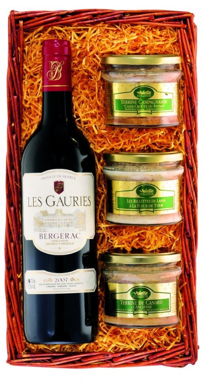 Košík naplněný výběrovými francouzskými lahůdkami. Láhev červeného vína „Les Gauries“ (0,75 l), sklenička teriny z divočáka (180 g), venkovská terina (180 g) a kachní terina (180 g).