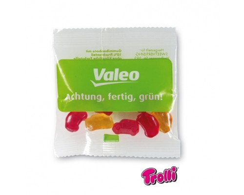 Hledáte malý a lehký dárek, který bude vašim zákazníkům chutnat? Želatinové bonbony různých barev a tvarů balené v sáčku z bílé nebo průhledné bezbarvé folie (flowpack) splňujÍ všechny vaše předpoklady. Nechte si potisknout sáček vaší reklamou nebo logem, poskytuje Vám k tomu dostatek prostoru. Vyberte si ze dvou základních možností zpracování: 4barevný digitální tisk nebo až 4barevný flexotisk od 20.400 ks. Obsahuje želatinové bonbony v premium kvalitě (cca 10% obsah ovoce) v barvách zelené, červené, oranžové, žluté a bezbarvé (pouze medvídci). Vyberte si například medvídky (mix barev), hvězdičky (mix barev), červená srdíčka, žluté smajlíky nebo autíčka (mix barev). Medvídci též v kvalitě fruit-juice (cca 24% obsah ovoce), bez příplatku, v barvách tmavě červené (černý rybíz), červené (třešeň a jahoda), oranžové (broskev a pomeranč) a žluté (citron). Vybrané ovocné koncentráty dodávají těmto želatinovým medvídkům jejich přírodní ovocné aroma a intenzivní přirozenou chuť.