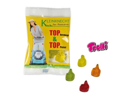 Dopřejte vašim zákazníkům báječný chuťový zážitek - želatinové bonbony chutnají každému bez rozdílu věku. Na Vás je výběr toho správného tvaru bonbonu, který se bude skvěle hodit do vaší reklamní kampaně. Bonbony jsou baleny v klasickém sáčku z bílé nebo průhledné bezbarvé folie (flowpack). Nechte si ho potisknout vaší reklamou či logem a vytvořte tak svůj vlastní originál. K tomu si vyberte jednu ze dvou základních možností zpracování: 4barevný digitální tisk nebo až 4barevný flexotisk od 5.400 ks. Sáček obsahuje želatinové bonbony v premium kvalitě (cca 10% obsah ovoce) v barvách zelené, červené, oranžové, žluté a bezbarvé (pouze medvídci). Na výběr jsou medvídci, hvězdičky, znak euro, telefonní sluchátka, autíčka, mobil, brýle, fotbalové míče, letadla, prasátka a domečky (vždy mix barev) a dále červená srdíčka a žlutí smajlíci. Medvídci též v kvalitě fruit-juice (cca 24% obsah ovoce), bez příplatku, v barvách tmavě červené (černý rybíz), červené (třešeň a jahoda), oranžové (broskev a pomeranč) a žluté (citron). Vybrané ovocné koncentráty dodávají těmto želatinovým medvídkům jejich přírodní ovocné aroma a intenzivní přirozenou chuť. V nabídce též větší sáček s 15 g bonbonů.