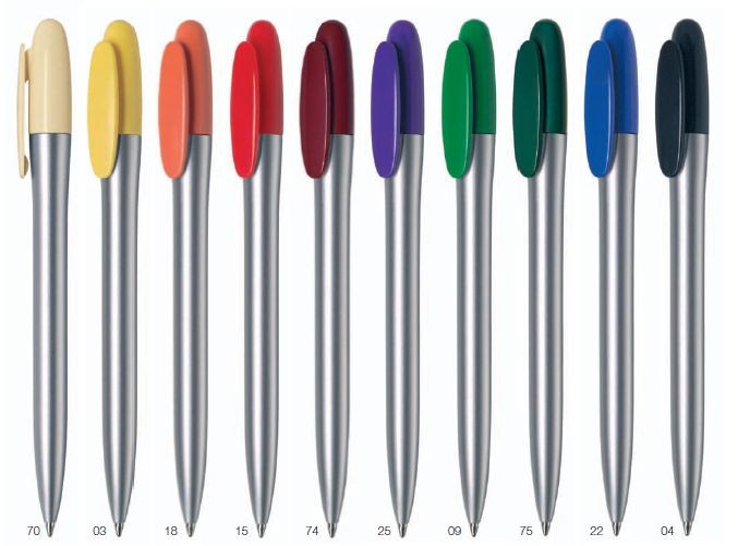 Kuličkové pero se stříbrným tělem, klip v plných barvách. Jednostranný potisk na horní otočnou část, na hlavním těle propisky buď jednostranně tamponovým tiskem nebo po celém obvodu sítotiskem.