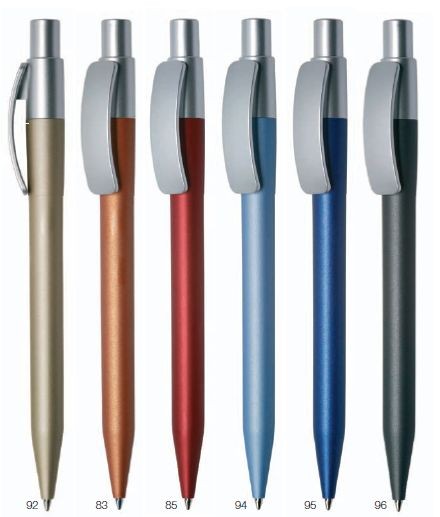 Kuličkové pero s tělem v metalických barvách s matným povrchem, klip a tlačítko stříbrné. Potisk na klip, na těle propisky buď oboustranně tamponovým tiskem nebo po celém obvodu sítotiskem.