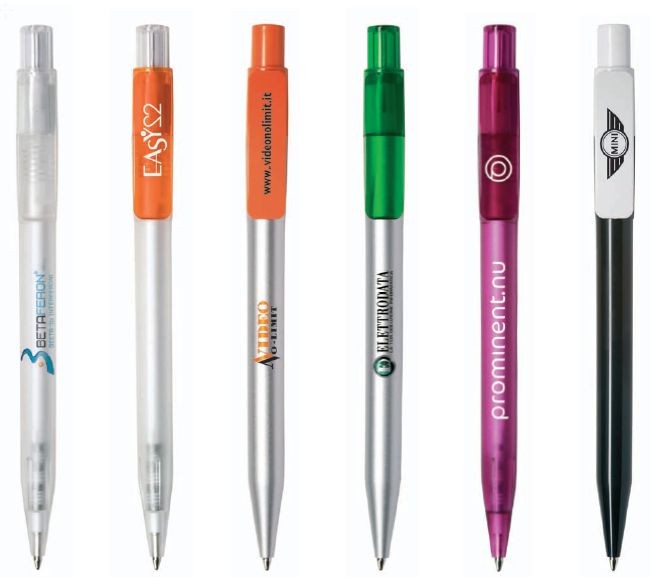 Kuličkové pero s matným, transparentním tělem. Klip lesklý, barevný. Potisk na klip, na těle propisky buď oboustranně tamponovým tiskem nebo po celém obvodu sítotiskem.