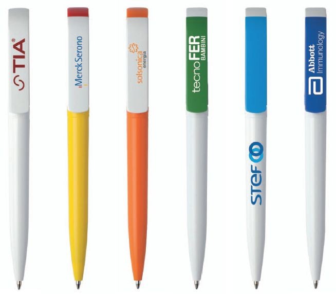 Kuličkové pero s bílým tělem, zátka v plných barvách. Potisk na klip, na zátku, na těle propisky buď jednostranně tamponovým tiskem nebo po celém obvodu sítotiskem.