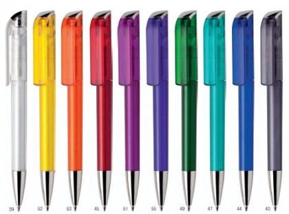 Kuličkové pero v transparentních barvách, zátka a špička kovové. Potisk na klip, na zátku, na těle propisky buď jednostranně tamponovým tiskem nebo po celém obvodu sítotiskem.