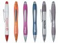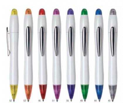 Kuličkové pero s bílým tělem, tlačítko a špička v transparentních barvách, klip kovový. Potisk na těle propisky pod klipem nebo na boku.