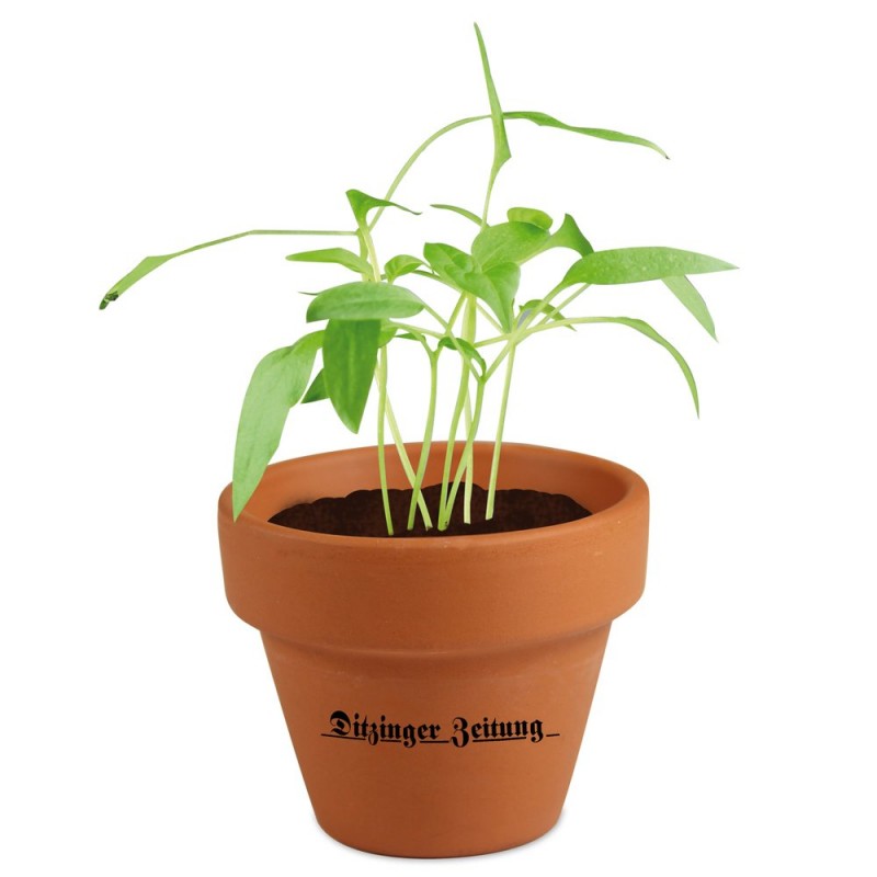 Tradiční terakotový květináč naplněný tabletou rašeliny a semínky dle vašeho výběru. Speciálně tvarovaný papírový obal zcela ve vašem individuálním designu a k tomu ještě jednobarevný potisk přímo na květináč. Tam najde místo například vaše logo, které tak zůstane na očích i po rozbalení, což zajišťuje trvalý účinek vaší reklamy. V nabídce 4 barvy květináče - terakota, bílá, červená a modrá. Možnost květináče i v lakovaném provedení. Na výběr jsou semena slunečnice, letních květin, měsíčku, kopretiny, řeřichy, směsi bylinek, papriky, bazalky, trávy, perského jetele, čtyřlístku, smrku a pomněnky, další druhy semen na vyžádání.