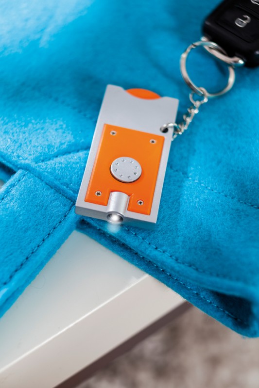 LED klíčenka "Shopping" s integrovaným žetonem pro nákupního košíku, bílým LED světlem a kroužkem na klíče. Výrazný prostor pro vaše logo.
