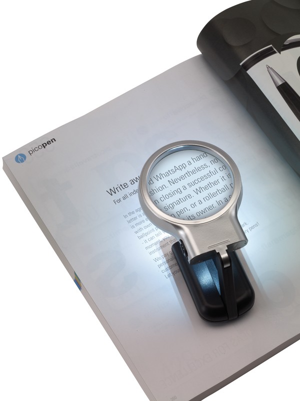 Lupa SHERLOCK s 3-násobným zvětšením. 2 bílá LED světla. S tlačítkem on/off na boku. S výrazným prostorem pro vaše logo. S rozkládacím podstavcem. Na baterií: 2 x AA( bez baterií)