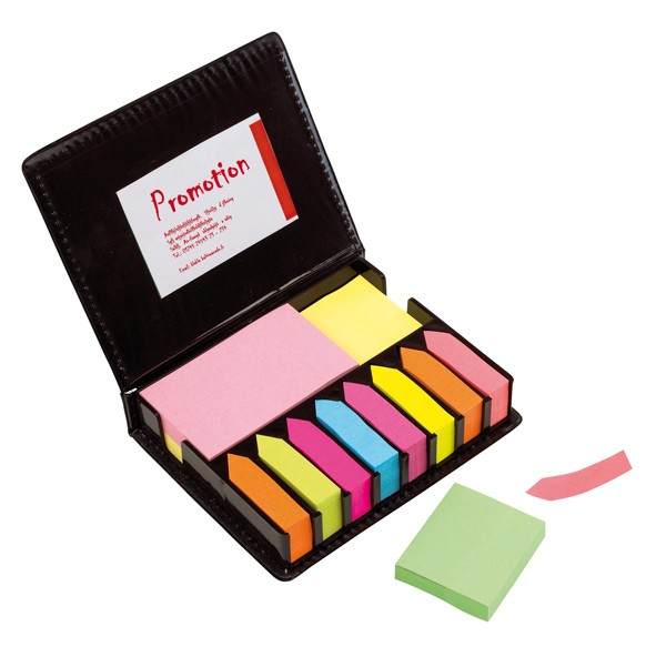 Memobox s "Remind me"se skládá ze samolepek ve tvaru šipky v 8 různých barvách a 4 samolepící podložky , transparentní držáky. Balené v pouzdře ze syntetické kůže.