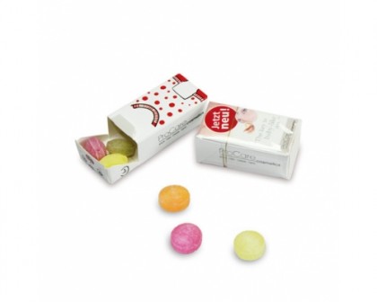 Udělejte radost stylově - nabídněte svým zákazníkům či zaměstnancům bonbony v praktické krabičce ve vašem vlastním designu. Krabička má ideální rozměr například do kabelky nebo do batohu a přesto poskytuje dostatek prostoru pro vaše individuální reklamní sdělení. Vyberte si 4barevný digitální tisk nebo až 4barevný ofsetový tisk již od malého množství. Široký výběr bonbonů. Krabička s vyklapovacím uzávěrem je vyrobena z papíru a je zabalena v ochranné folii z průhledného celofánu. Obsahuje 10 g nebalených mini bonbonů, na výběr 6 příchutí - třešeň-mentol + vitamín C, ovocný mix, peppermint, peppermint ve variantě bez cukru, Jelly Beans (mix barev a chutí, 100% přírodní příchutě, 15 g), mini čokoládový drops (mix barev, 15 g, možný pouze ofsetový tisk).