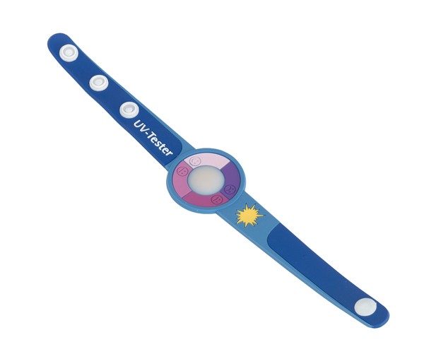 Nastavitelný náramek "Sun protector" s UV testerem a návodem k použití. Střední oblast mění barvu v závislosti na UV záření. Se 4 smajlíky kteří vědí, jak silné je UV záření.