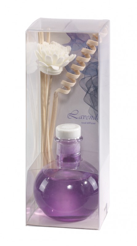 Pokojová vůně"Pretty Flavour" – se skládá z dekorativní vázičky ve fialové barvě, s květinou a rákosem. Plněné aromatickým levandulovým olejem (cca 80 ml). Baleno v krabičce.