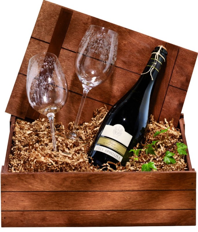Dvě sklenice na víno s vkusnými ornamenty a láhev lehkého secca „Villa Armellina“ (0,75 l). Krásný dárek, který jistě nezůstane nevyužit.