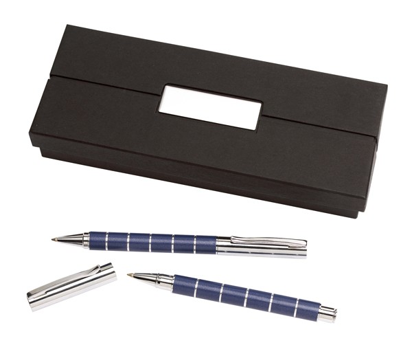 Psací souprava "Angelo" obsahuje kuličkové pero s modrým inkoustem a kuličkové pero s černým inkostem. Baleno v dárkové krabičce s kovovou deskou.