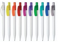 Kuličkové pero s bílým tělem, klip a tlačítko v transparentních barvách. Potisk na klip, na těle…