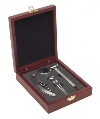 Sada na víno "Salute" v dřevené krabici s teploměrem na víno, kroužkem na víno, zátkou a čísnickým nožem. Ideální reklamní dárek.