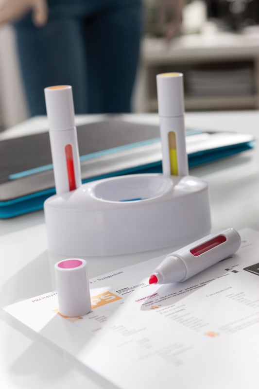 Sada zvýrazňovačů "Desk Star" se skládá z 1 podstavce na držení zvýrazňovačů s odkládacím prostorem pro papírové svorky a třech zvýrazňovačů (žlutá, oranžová a růžová barva) s barevně odlišnými uzávěry. S průzorem pro kontrolu obsahu.