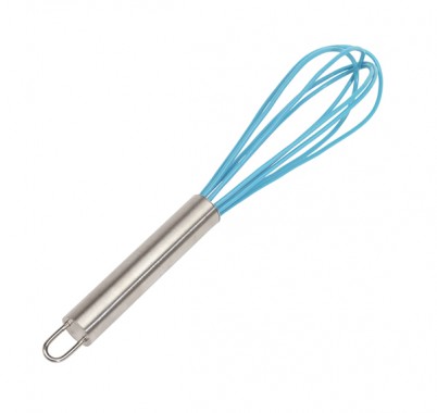 Šlehací metla "Quiryl" ze silikonu s tělem z nerezové oceli a poutkem na rukojeti pro zavěšení.