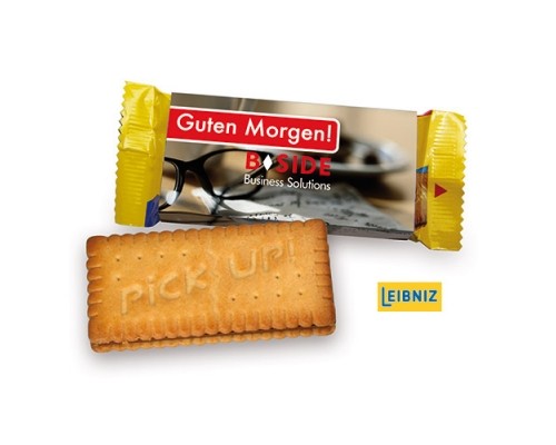 Připravte svým zákazníkům sladkou svačinu - sušenky Leibniz Pick Up s čokoládou ve vašem vlastním designu. Budete překvapeni, kolik reklamního prostoru tím získáte. Využijte výhody digitálního tisku a nechte si papírový obal potisknout podle svého. Sušenka je jako sendvič s mléčnou čokoládovou náplní, baleno jednotlivě.