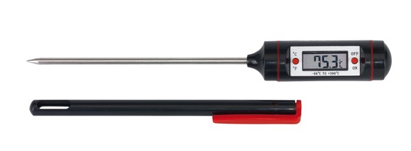 Teploměr na vaření "Hot spot" s měrkou z nerezové oceli a LCD displejem. Tlačítko na vypínání/zapínání. S možností přepínání mezi °C a °F. Obal s červeným klipem a poutkem pro zavěšení.