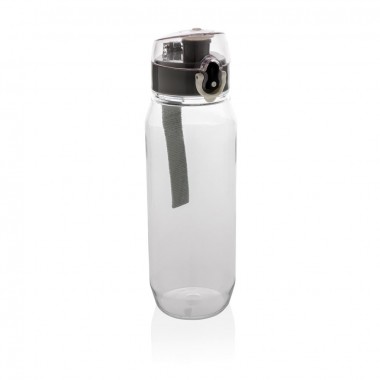 Leak proof tritan bottle with lockable cap and single hand 'press open' function. Including carrying strap. Odourless and 100% BPA-free. Content: 800ml.