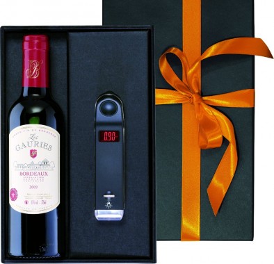 Kompaktní, jednoduchá, užitečná! Malá láhev „Les Gauries, Bordeaux“ (0,375 l) a digitální měřič tlaku v pneumatikách s LED svítilnou.