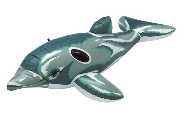 Velký nafukovací delfín "Roxy" je kombinaci barev stříbrná/zelená s černými madly pro držení.
