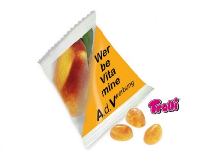 Spojte svou reklamu s originálním balením želatinových vitamínových bonbonů. Želatinové bonbony s vitamíny v netradičním čtyřstěnném sáčku z bílé nebo průhledné bezbarvé folie (flowpack) dokáží upoutat pozornost. Využijte toho a nechte si sáček potisknout po svém. Vyberte si 4barevný digitální tisk nebo až 4barevný flexotisk a vytvořte svůj vlastní originál. Nabídněte ho třeba jako malou pozornost, poděkování za návštěvu nebo na zpříjemnění chvíle čekání. Obsahuje želatinové bonbony s příchutí broskve v kvalitě fruit-juice s kousky ovoce a 10 vitamíny.